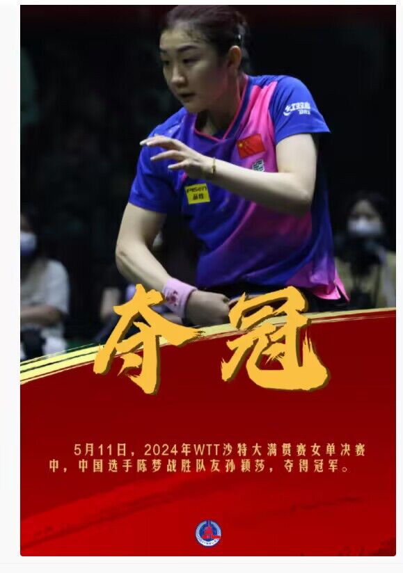 今天,在2024年WTT沙特大满贯赛女单决赛中,中国选手陈梦战胜队友孙颖莎 ,夺得冠军。祝贺陈梦,孙颖莎辛苦了!拼过就是胜利,继续加油!(记者:王海洲)