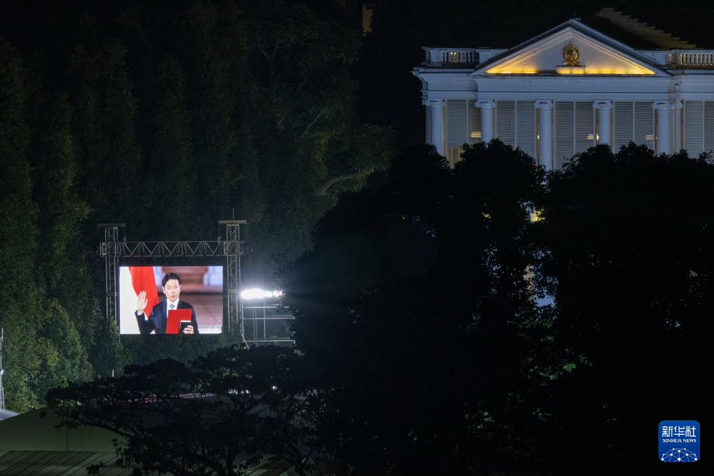 5月15日,新加坡总统府内的电子屏显示新加坡新任总理黄循财出席宣誓就职仪式。新华社发(邓智炜摄)