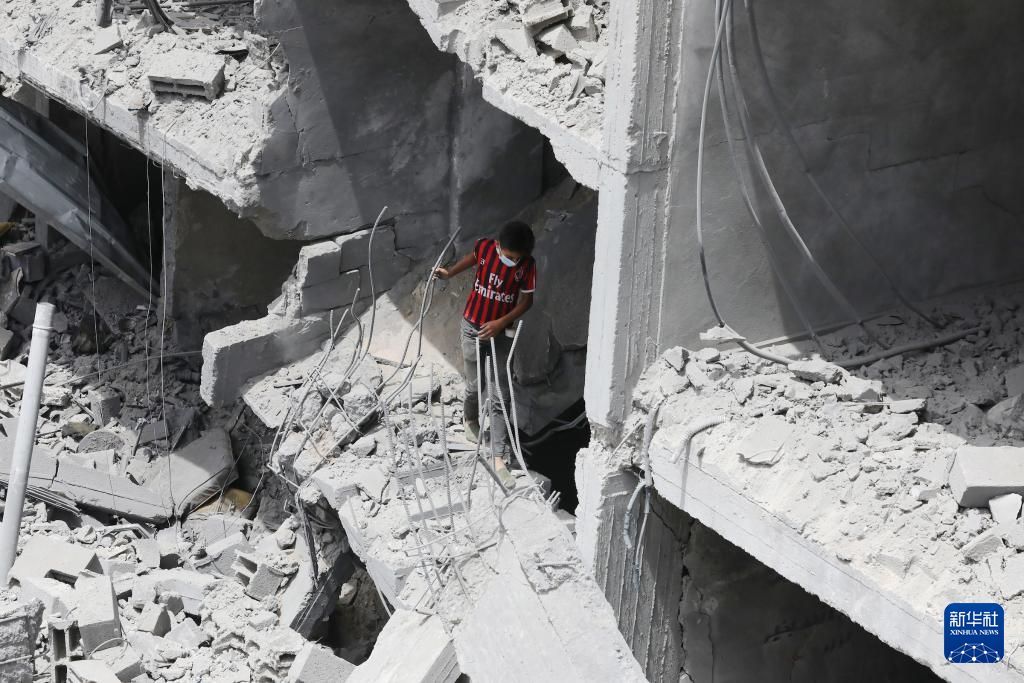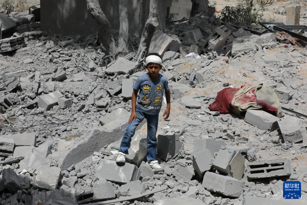 5月19日,在加沙地带中部努赛赖特难民营,一名巴勒斯坦男孩站在以军空袭后的废墟上。新华社发(巴勒斯坦通讯社供图)