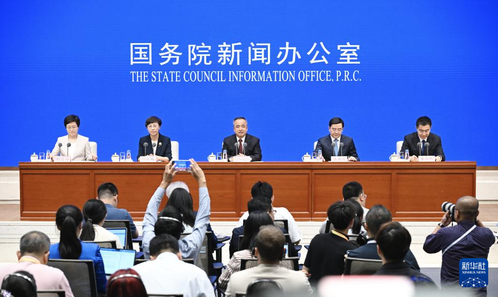 5月21日,国务院新闻办公室在北京举行“推动高质量发展”系列主题新闻发布会,新疆维吾尔自治区党委副书记、自治区主席艾尔肯·吐尼亚孜,新疆维吾尔自治区党委常委、自治区常务副主席陈伟俊,新疆维吾尔自治区副主席孙红梅,新疆维吾尔自治区发展改革委党组书记、副主任王岿然围绕“以高质量发展新成效扎实推进中国式现代化新疆实践”作介绍,并答记者问。新华社记者 陈晔华 摄