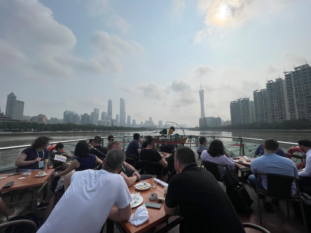 4月15日,采购商从入住的白天鹅宾馆乘坐定制接驳交通船前往第135届广交会场馆。新华社记者霍思颖摄