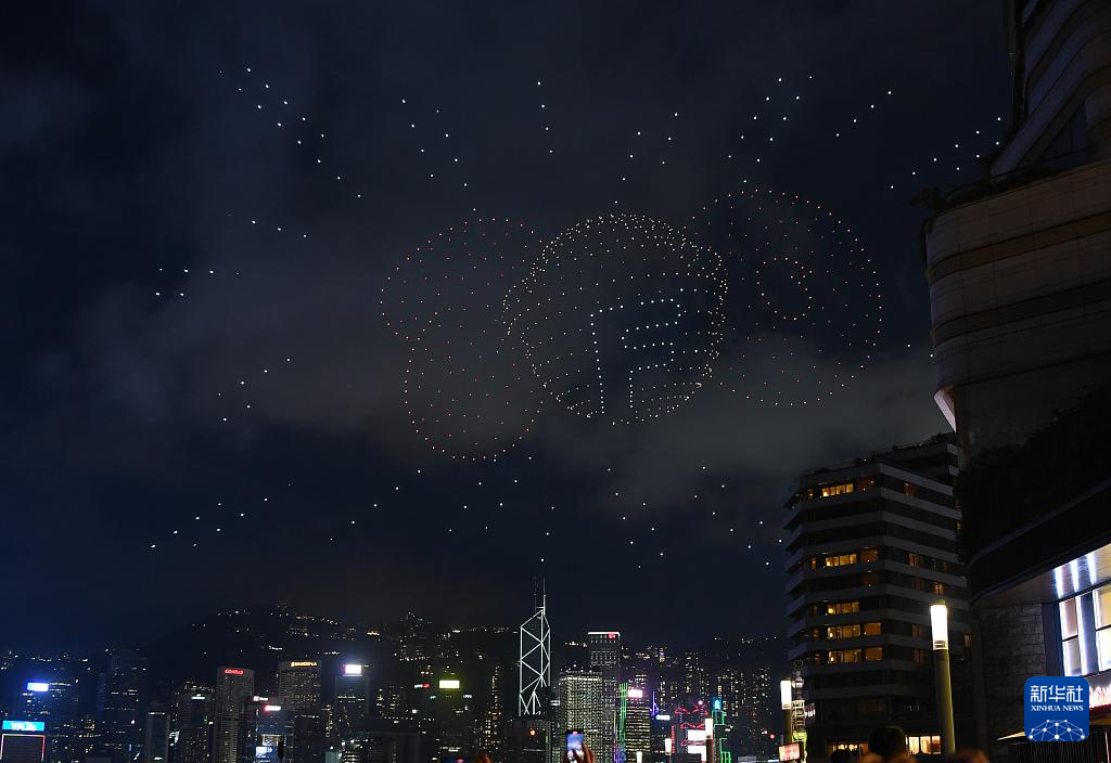 5月25日,无人机在维港上空拼成“100%朋友召唤铃”图案。新华社记者 陈铎 摄