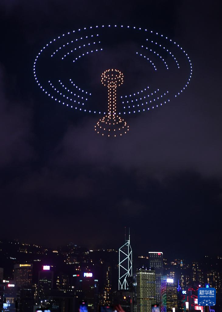 5月25日,无人机在维港上空拼成“竹蜻蜓”图案。新华社记者 陈铎 摄