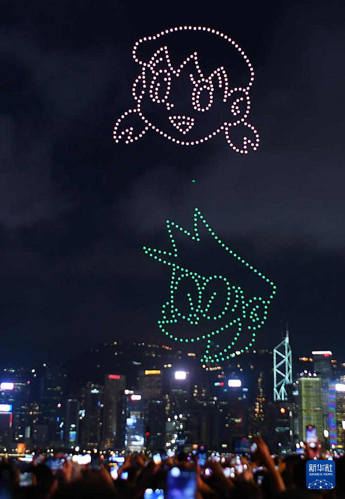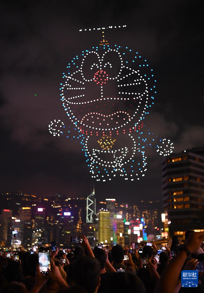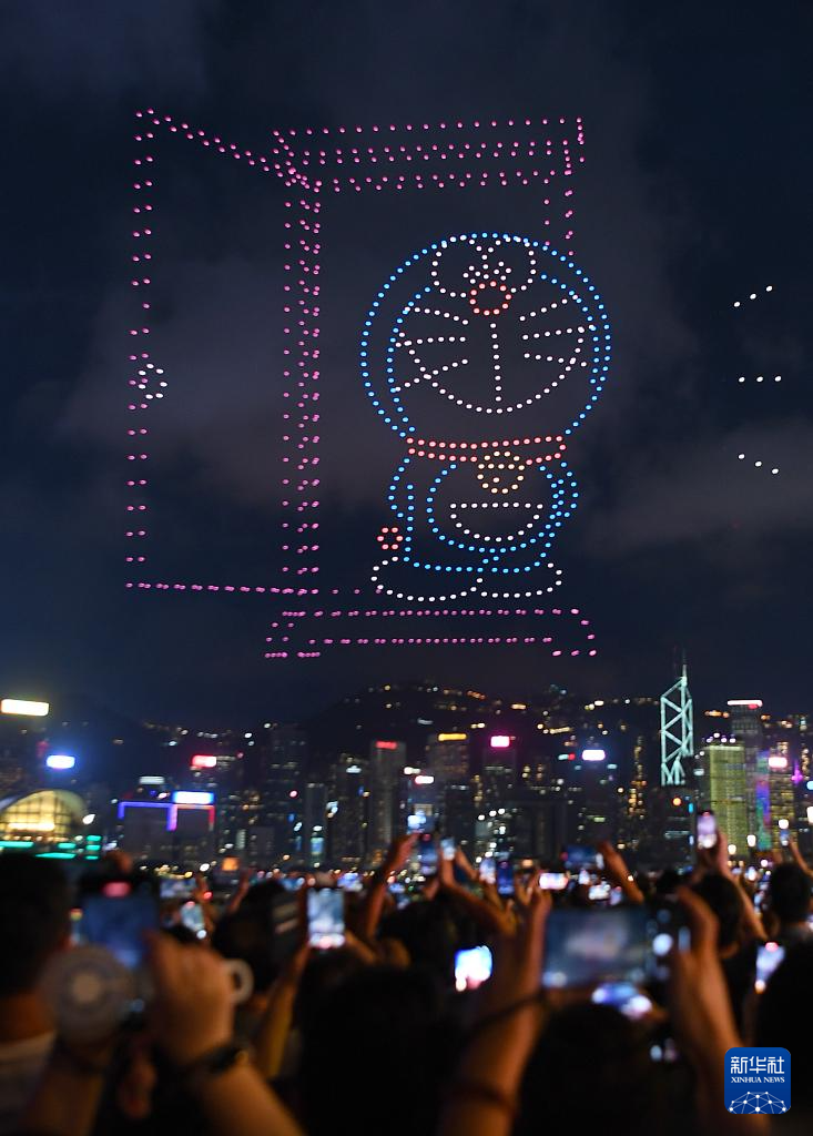 5月25日,无人机在维港上空拼成“哆啦A梦”经典角色图案。新华社记者 陈铎 摄