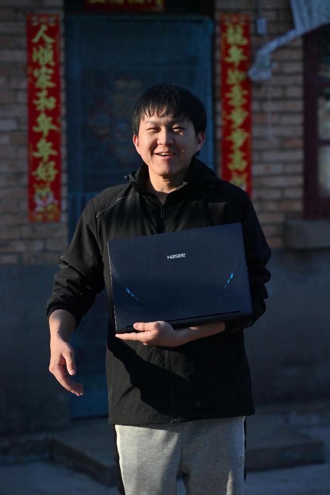 在柳州市鹧鸪江路附近一处出租屋外,熊三耶在展示刚刚购买的笔记本电脑(2024年2月11日摄)。新华社记者黄孝邦摄