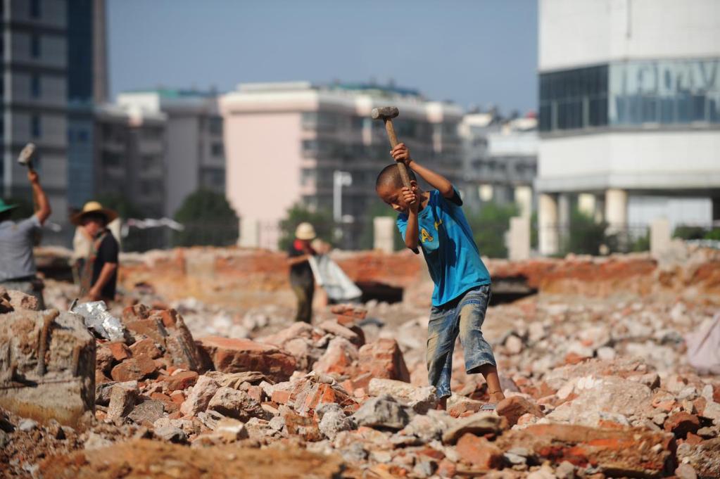 在柳州市北雀路一处工地,熊三耶和伙伴们在打铁(2013年8月29日摄)。新华社记者黄孝邦摄