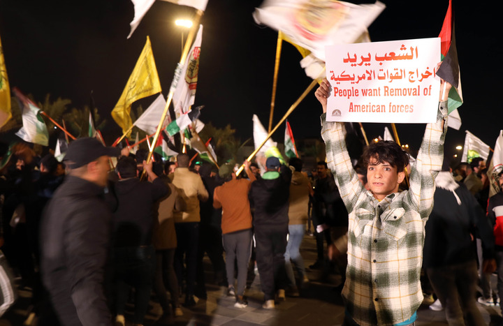 1月13日,在伊拉克首都巴格达解放广场,民众手持“人们希望美军撤离”的标语。新华社发(哈利勒·达伍德摄)