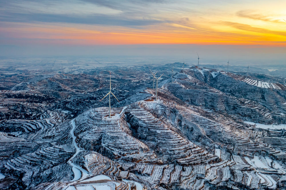 这是在山西省运城市万荣县境内拍摄的风力发电机组(无人机照片,2024年1月24日摄)。新华社发(闫鑫 摄)