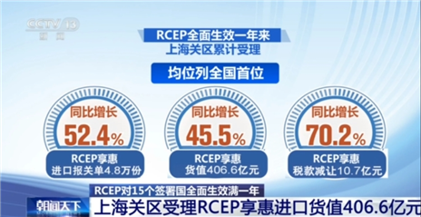 而在上海,RCEP全面生效一年来,上海关区累计受理RCEP享惠进口报关单4.8万份,货值406.6亿元,税款减让10.7亿元,均位列全国首位,同比分别增长52.4%、45.5%和70.2%,享惠进口货物主要包括塑料及其制品、机器机械器具以及零件、电气设备及其零件等。