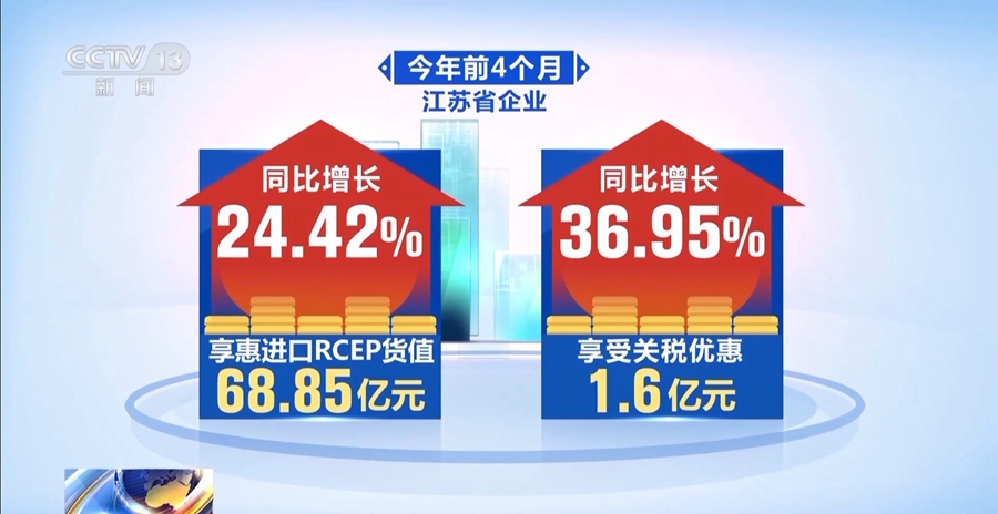 据统计,今年前4个月,江苏省企业享惠进口RCEP货值68.85亿元,享受关税优惠1.6亿元,同比分别增长24.42%和36.95%。