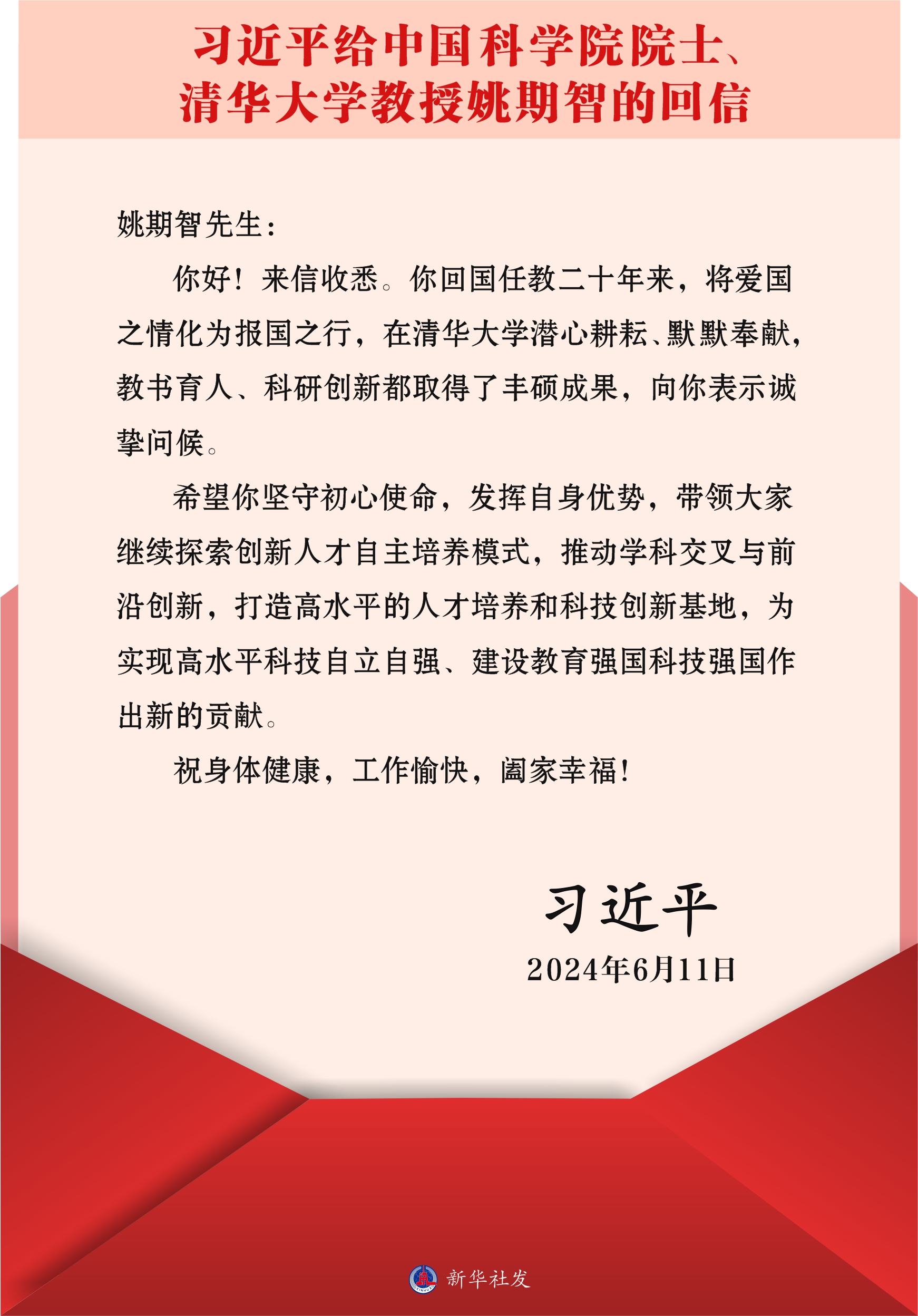 新华社北京6月12日电 近日,中共中央总书记、国家主席、中央军委主席习近平给中国科学院院士、清华大学教授姚期智回信,向他致以诚挚问候并提出殷切希望。