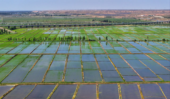 春天的宁夏平原引黄灌区,一片生机勃勃、绿意盎然。从银川市出发,驱车沿黄河一路行进,两岸水清岸绿、风景宜人。以黄河河道为轴,河中波光粼粼的广阔水面好似银镜倒映着蓝天白云,河道两侧大小湖泊棋布,空中鸥鸟翔鸣,岸边林草丰美,步道游人漫步,铺陈开一幅人与自然和谐共处的美丽生态画卷。当车辆行驶过引黄灌溉的大片农田,目之所及是翠绿的秧苗迎风轻摆,如果从高空俯瞰,一块块稻田在不同的光线角度下,有些青绿有些嫩黄,好似一块大自然的调色盘。