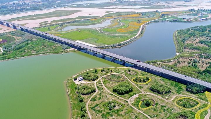 初春时节的黄河宁夏段河水清澈、碧波荡漾,一改人们印象中河水泛黄的景象。这是黄河流经宁夏银川市鹤泉湖大桥的景象(资料照片)。新华社记者 冯开华 摄
