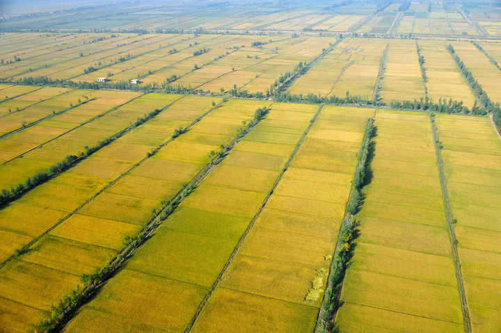 这是位于宁夏银川市境内黄河岸边的稻田(资料照片)。