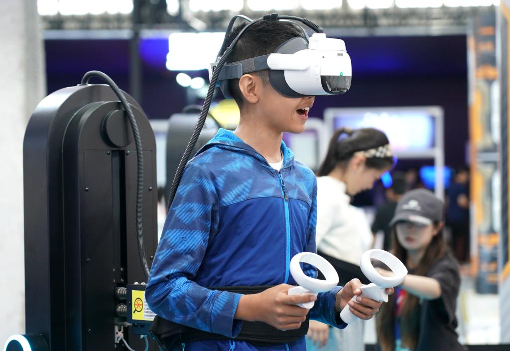 4月27日,第八届中国科幻大会在北京开幕。图为当日小朋友在科幻嘉年华现场体验VR游戏。 新华社记者 张晨霖 摄
