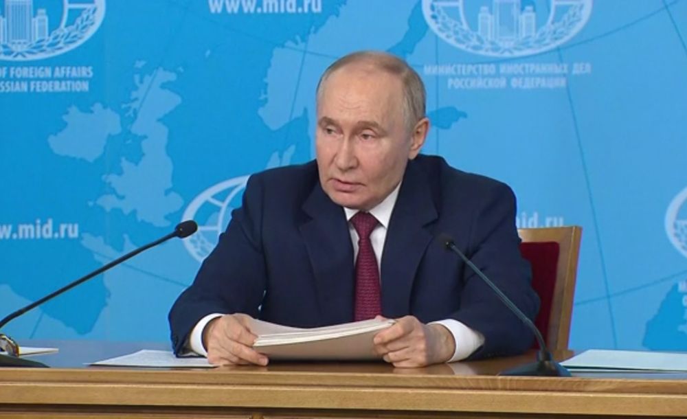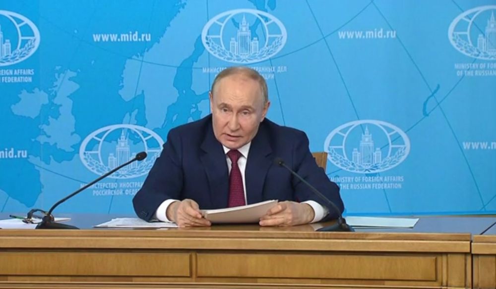 ↑6月14日,在俄罗斯首都莫斯科,俄罗斯总统普京在俄外交部发表讲话(视频截图)。新华社发