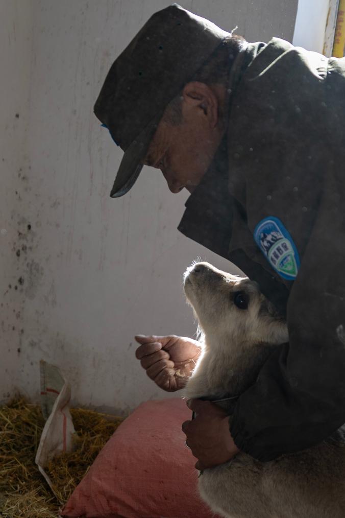 罗布玉杰站的野生动物专业管护队员在出发巡护前给站里救护的受伤藏原羚喂糌粑(5月7日摄)。新华社记者 姜帆 摄
