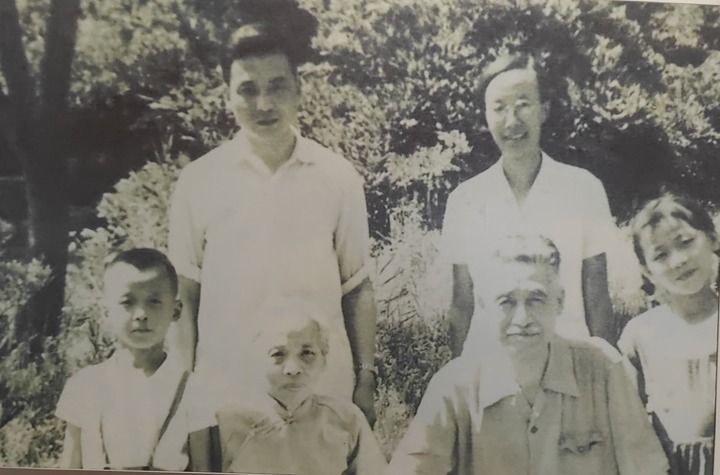 邓稼先的家庭合影。前排左起:王淑蠲(邓稼先母亲)、邓以蛰(邓稼先父亲);后排左起:邓志平、邓稼先、许鹿希、邓志典。(资料照片)