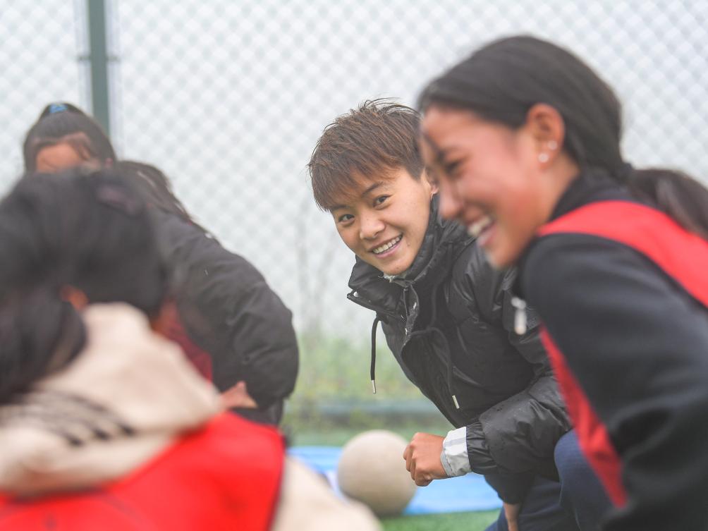 6月18日,王霜(右二)指导瓦吾小学女足队员训练。新华社记者 王曦 摄