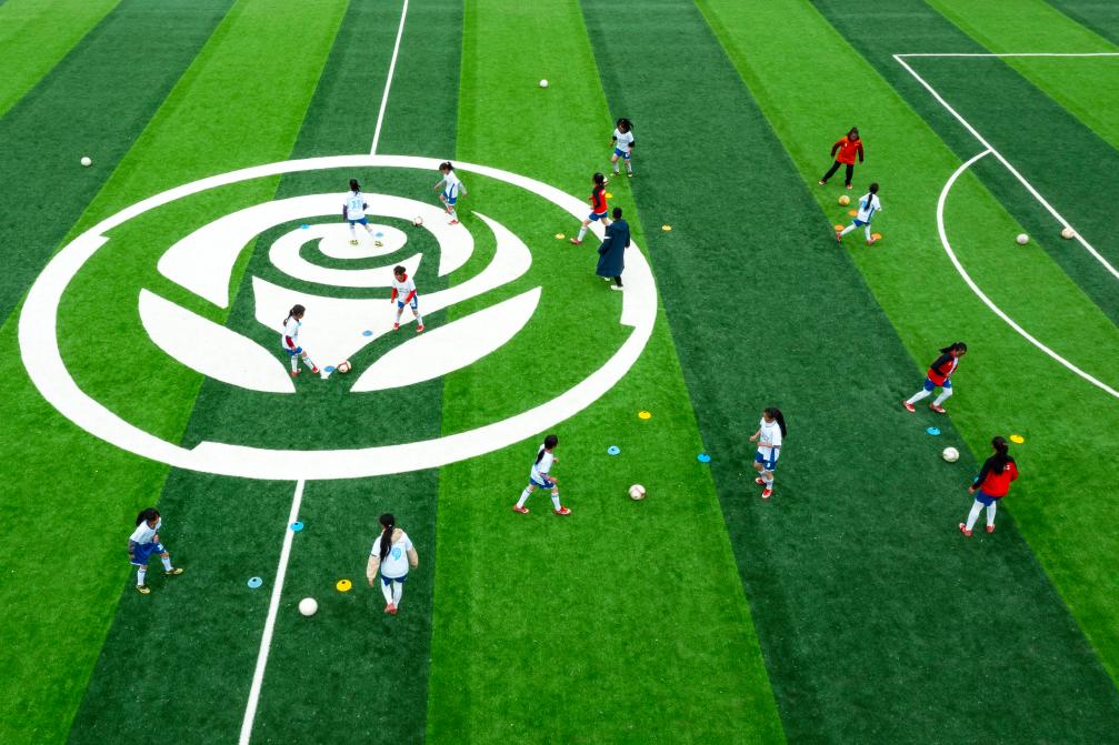 资料图:瓦吾小学的女足队员们在“玫瑰梦想球场”上训练。新华社记者 沈伯韩 摄