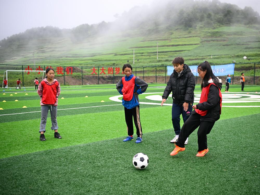 “一天三至四练”,当听到孩子们每日的训练计划时,王霜有些惊讶。“很多城里专门练球的孩子都很难有这样的持续性,她们却在坚持这么做,我很感动。”上午8点,曲比史古郑重地把他平常带领的4至6年级近20名女足球员未来一周的“训练权”交给了王霜,“小王指导”的第一堂课开始了。