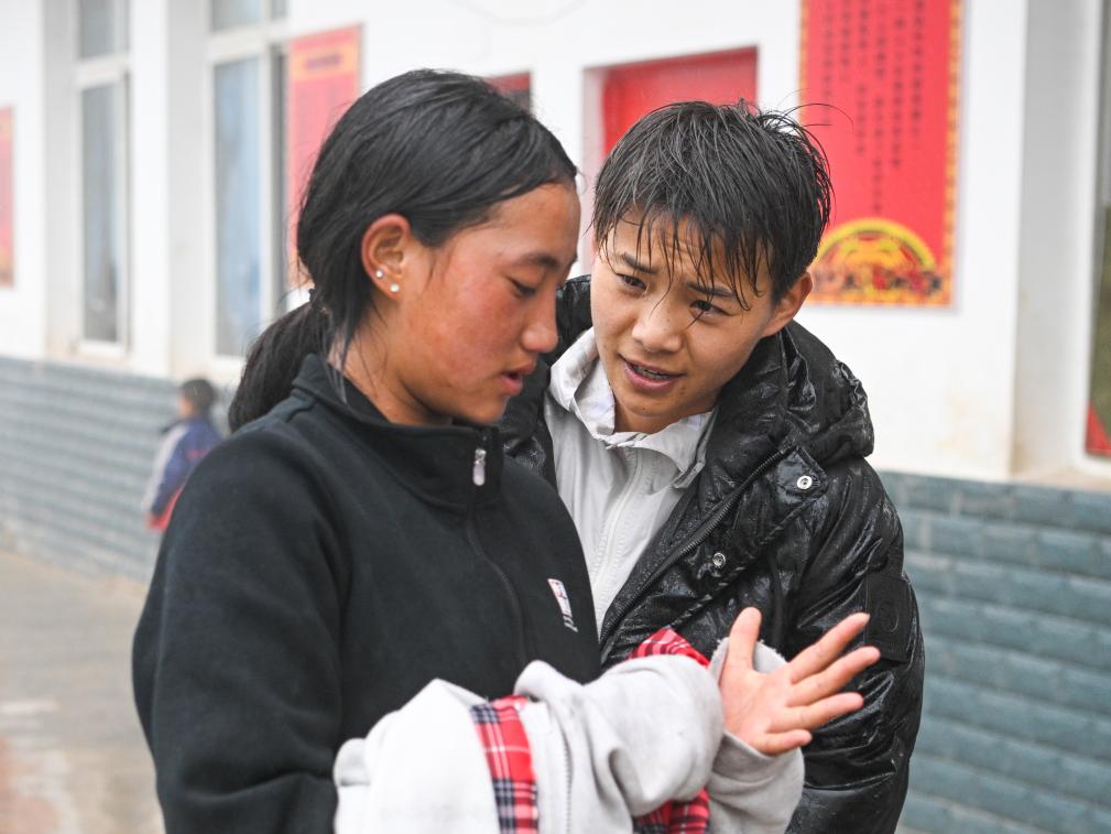 6月18日,王霜(右)和瓦吾小学女足队员约则伍支在训练后交流。新华社记者 王曦 摄