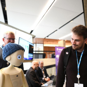 5月30日,在瑞士日内瓦举行的2024年“人工智能造福人类全球峰会” 上,参会者和一个用于社会关怀的机器人互动。新华社记者连漪摄