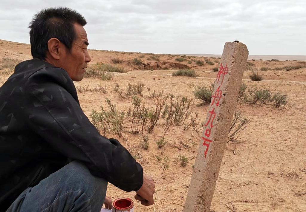 6月23日,四子王旗脑木更苏木(乡)阿莫吾素嘎查(村)牧民杨文俊在神舟九号载人航天飞船着陆点的水泥桩上,郑重地用红油漆描出“神舟九号”字样。