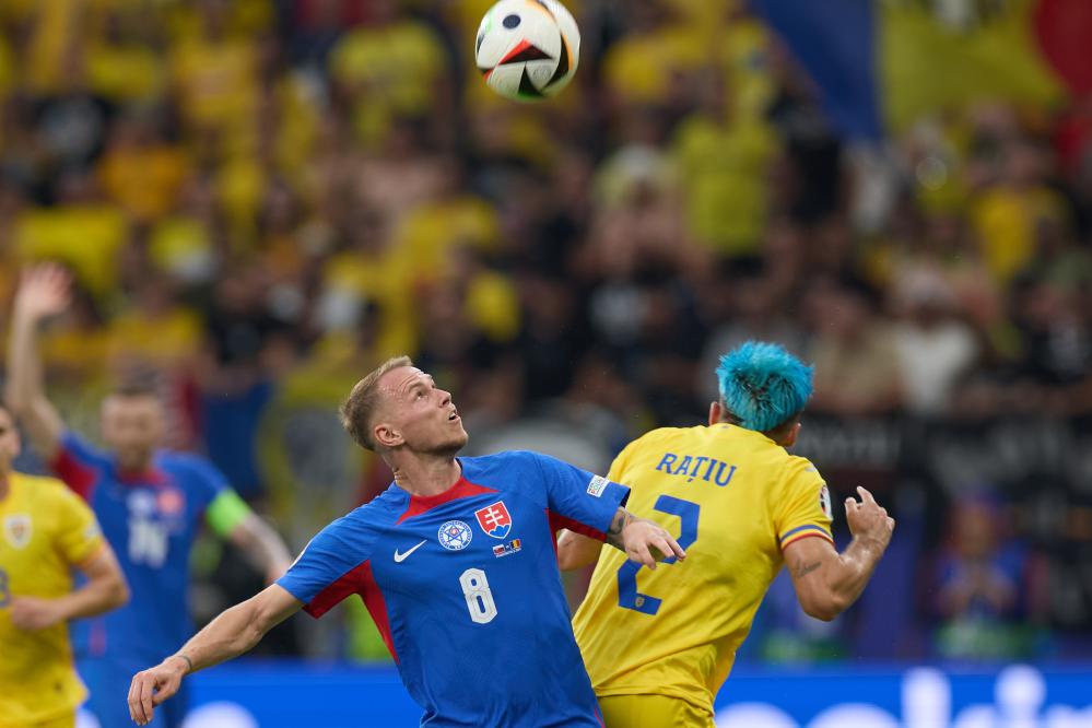 6月26日,斯洛伐克队球员奥德·杜达(左)与罗马尼亚队球员安德烈·拉蒂乌在比赛中拼抢。新华社记者 孟鼎博 摄