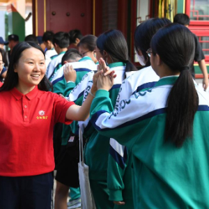 6月24日,在北京一零一中双榆树校区考点,考生进入考点前与老师击掌。当日,2024年北京市初中学业水平考试正式拉开帷幕。新华社记者 任超 摄