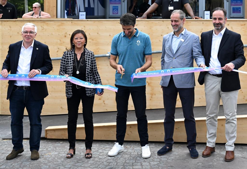 6月27日,巴黎奥组委主席托尼·埃斯坦盖(中)为巴黎奥运会官方特许商品旗舰店剪彩。新华社记者 贺长山 摄