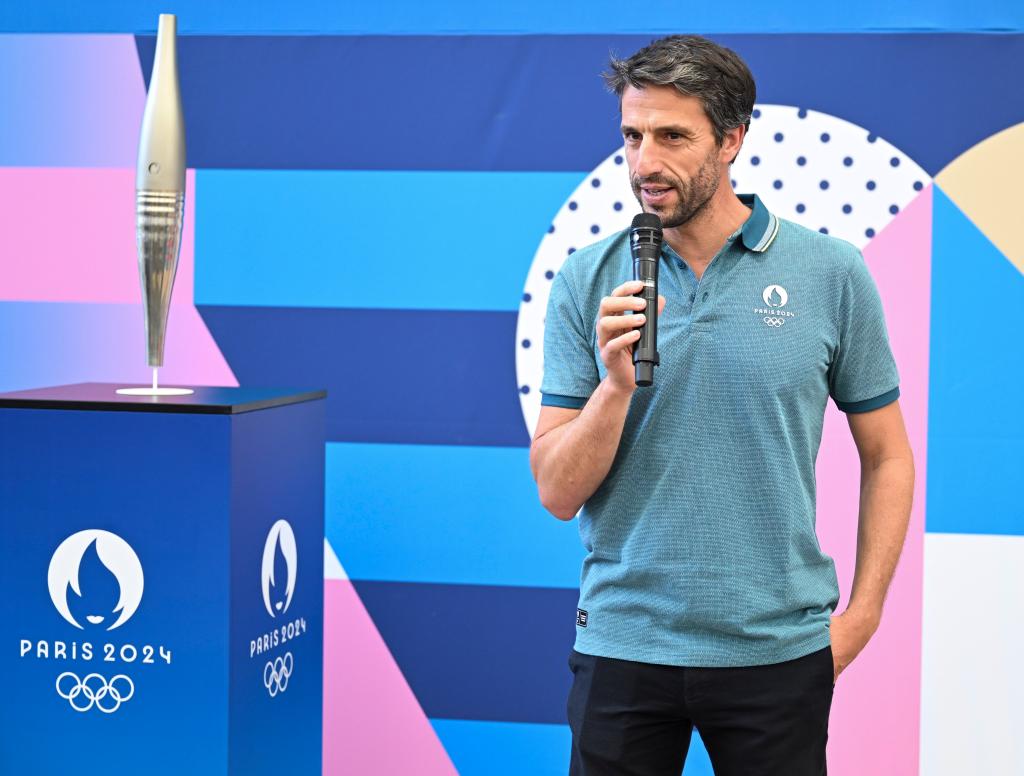 6月27日,巴黎奥组委主席托尼·埃斯坦盖在巴黎奥运会官方特许商品旗舰店接受采访。新华社记者 贺长山 摄