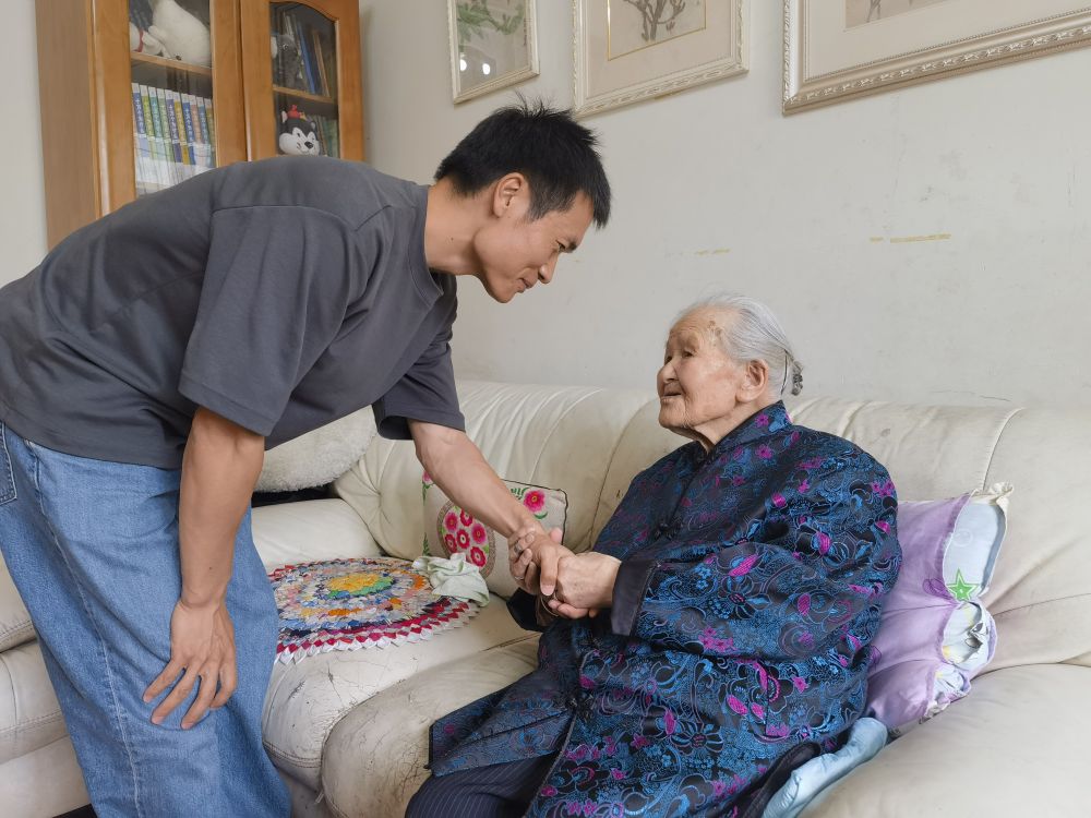 ↑2024年6月24日,老红军鲍彦章和联勤保障部队第940医院医护人员交流。新华社发(丁小涵摄)