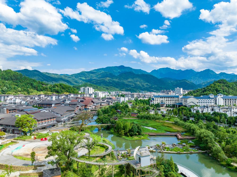 蓝天白云下的江西宜春温汤镇。(陈旅 摄)