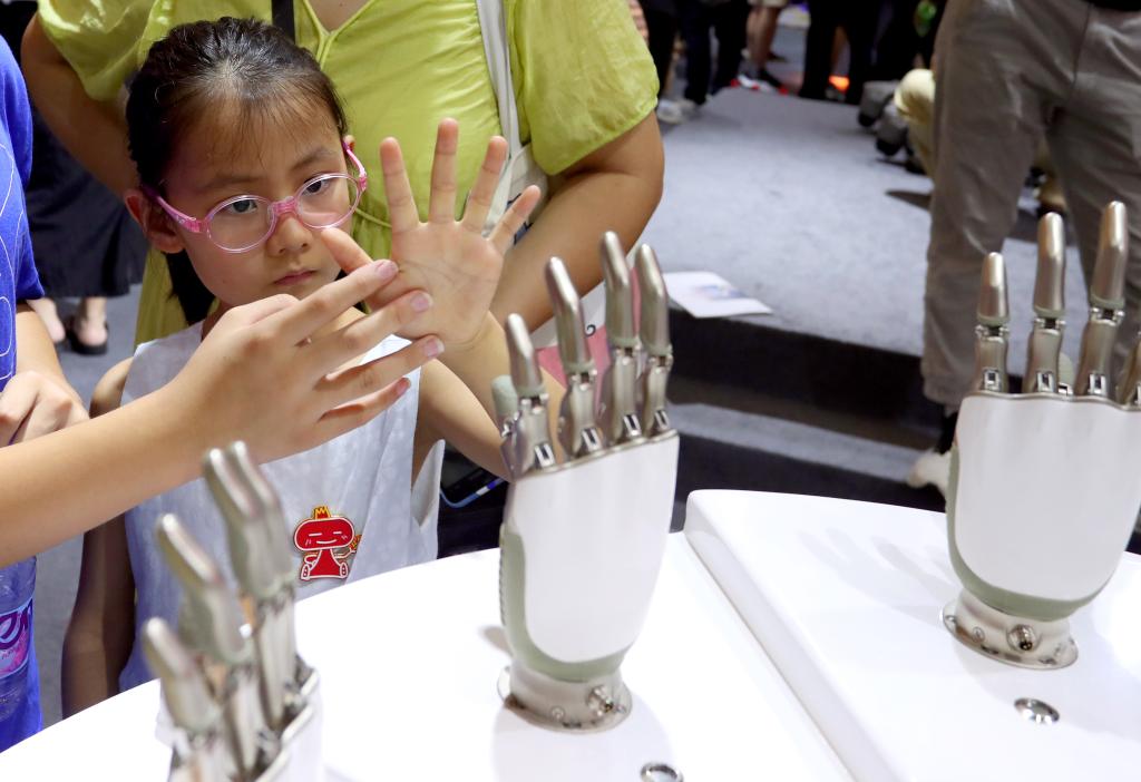 7月5日,一个小朋友在傲意科技机器人灵巧手展品旁认真观看。正在上海举行的2024世界人工智能大会展览会现场,众多机器人在这里展示各自的“本领”,舞蹈、绘画、杂技、按摩、做家务……在AI智能帮助下,机器人能做的事也越来越多,让众多参观者赞叹不已。 新华社记者 方喆 摄