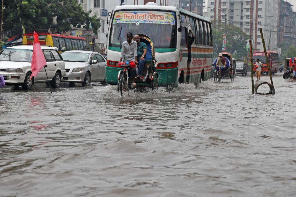 7月2日,在孟加拉国首都达卡,人们在发生内涝的街道上行进。新华社发
