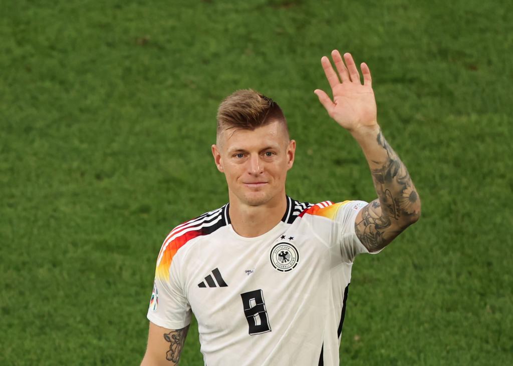 7月5日,德国队球员克罗斯赛后向观众致意。当日,在德国斯图加特进行的2024年欧洲足球锦标赛四分之一决赛中,西班牙队2比1战胜德国队,晋级四强。新华社记者 张帆 摄