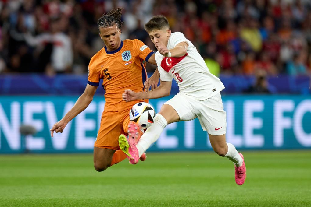 7月6日,荷兰队球员内森·阿克(左)与土耳其队球员阿尔达·居莱尔在比赛中拼抢。当日,在德国柏林进行的2024年欧洲足球锦标赛四分之一决赛中,荷兰队2比1战胜土耳其队,晋级四强。 新华社记者 孟鼎博 摄