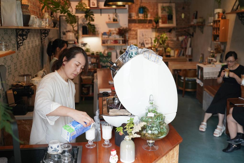 7月11日,“瓶子花”咖啡民宿主理人王妮娜(左)在为顾客制作饮品。新华社记者邵瑞 摄