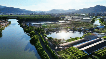 河水如长龙玉带般紧绕村庄,埭美村因水而灵动(7月10日摄)。