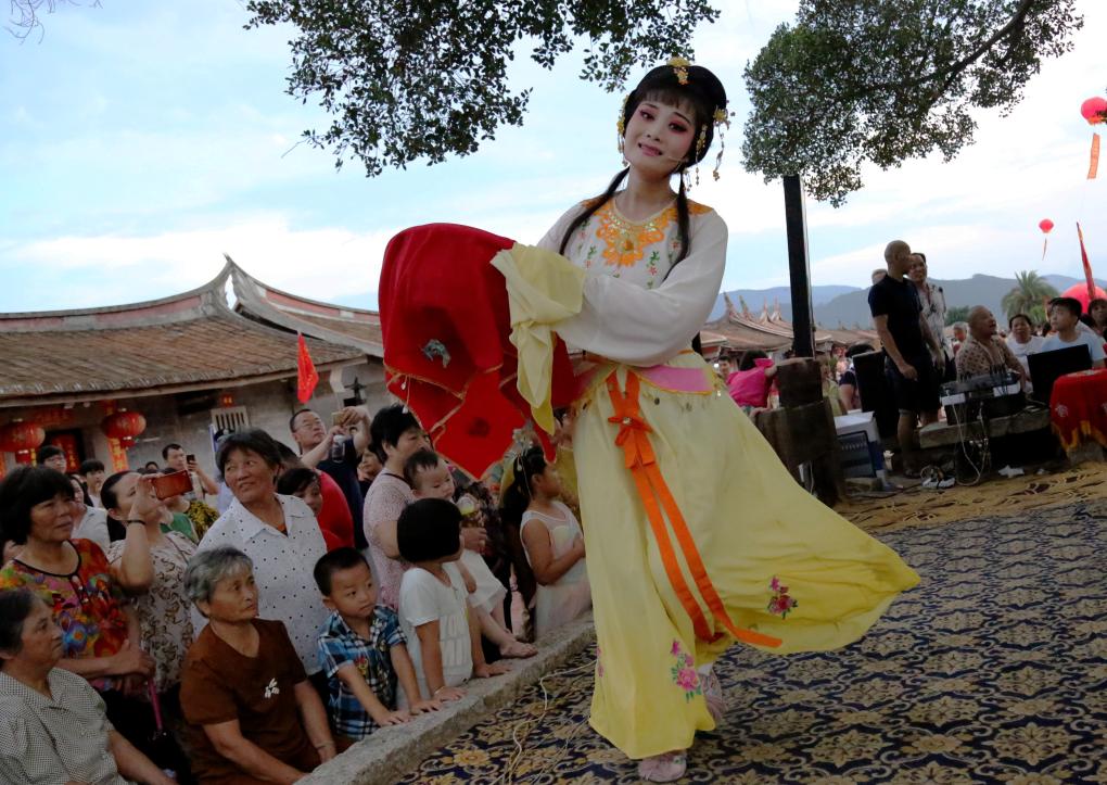 芗剧演员在埭美村广场为村民们表演芗剧(资料照片)。