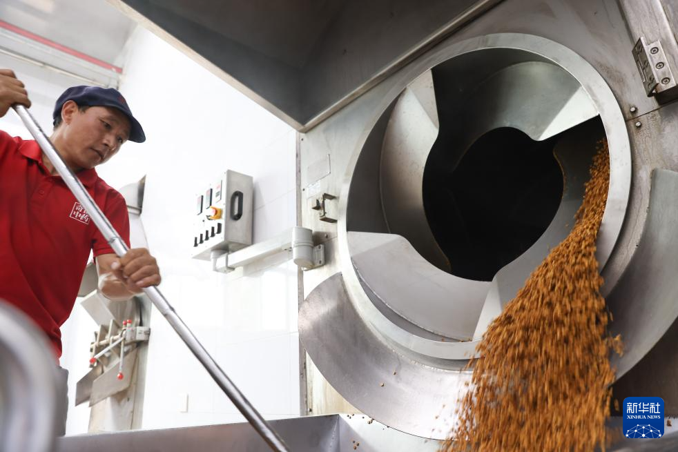 7月22日,工作人员在甘肃天水市甘谷县安远镇大城村的辣椒烘干和加工车间给辣椒粉过筛。 新华社记者 吕帅 摄