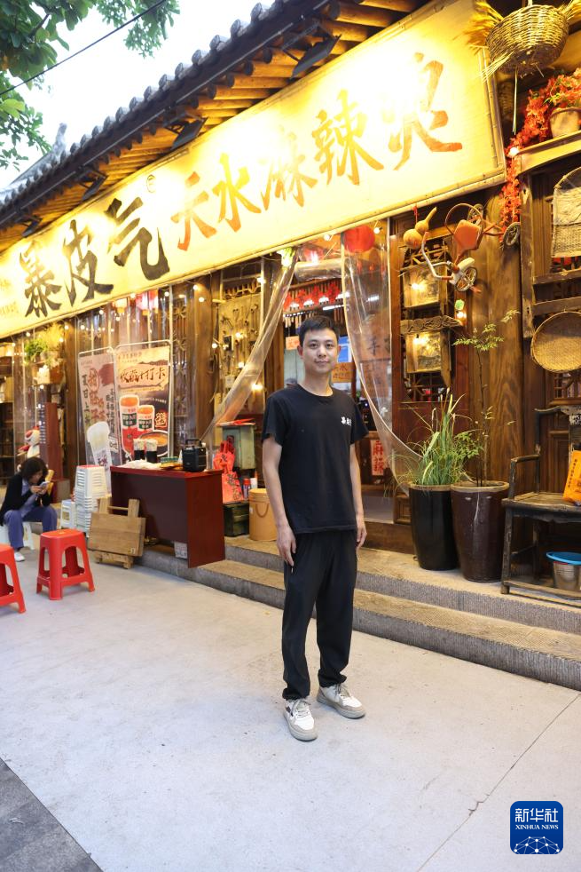 7月22日,经营麻辣烫店10多年的商户郝二龙在甘肃天水古城的一家麻辣烫店门前。 新华社记者 吕帅 摄