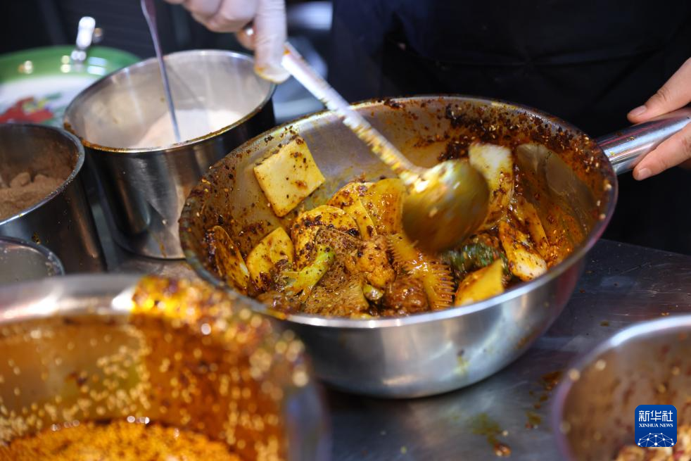 7月22日,工作人员在甘肃天水古城的一家麻辣烫店上菜。 新华社记者 吕帅 摄