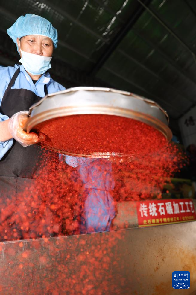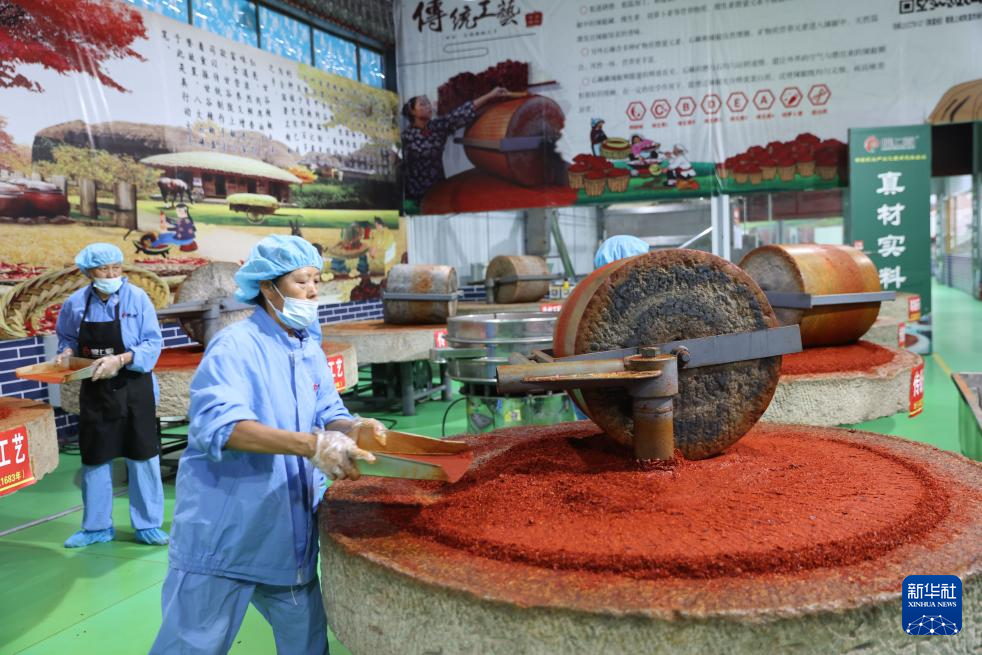 在甘谷县安远镇大城村,辣椒烘干和加工车间里,电力带动的石碾、石臼,正在模仿传统工艺,一圈一圈地磨、一上一下地杵。公司负责人说,创新的这条生产线是按传统手工工艺生产,能更好地保留辣椒的香味。