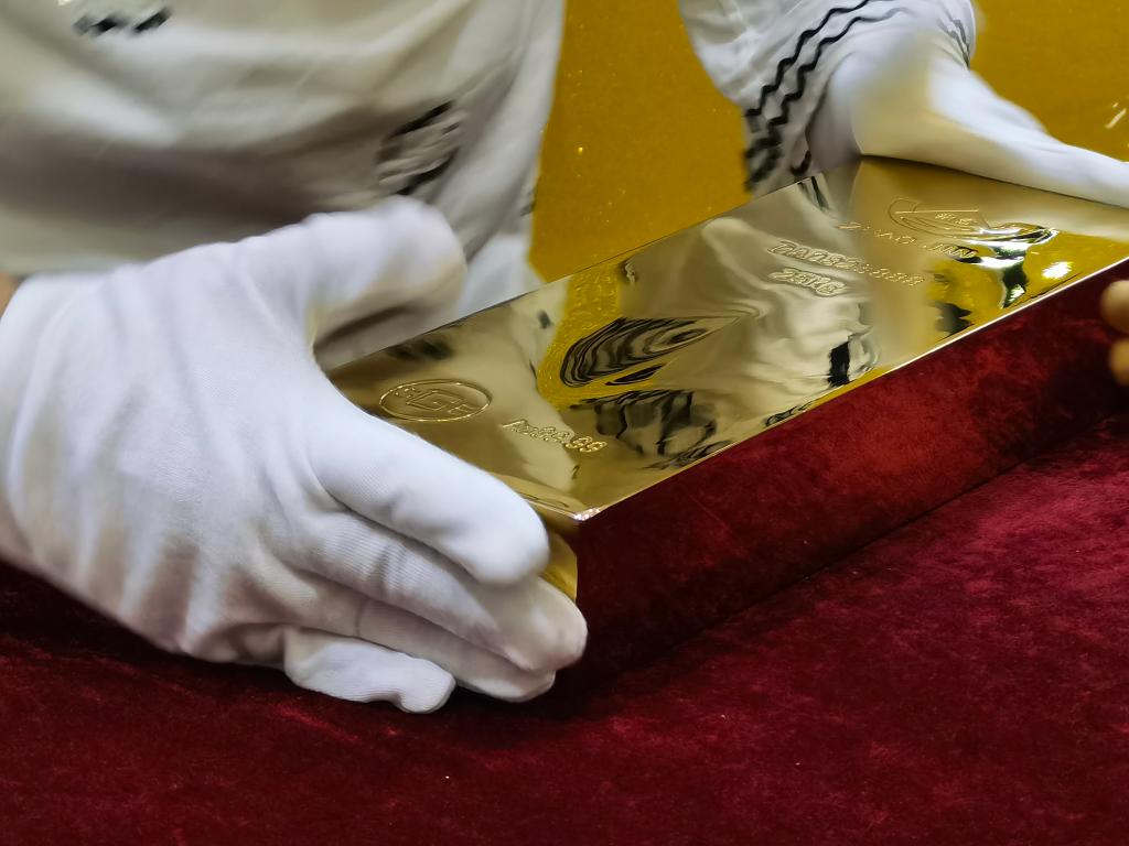 这是5月9日在山东招金金银精炼公司拍摄的金砖。新华社记者 任军 摄