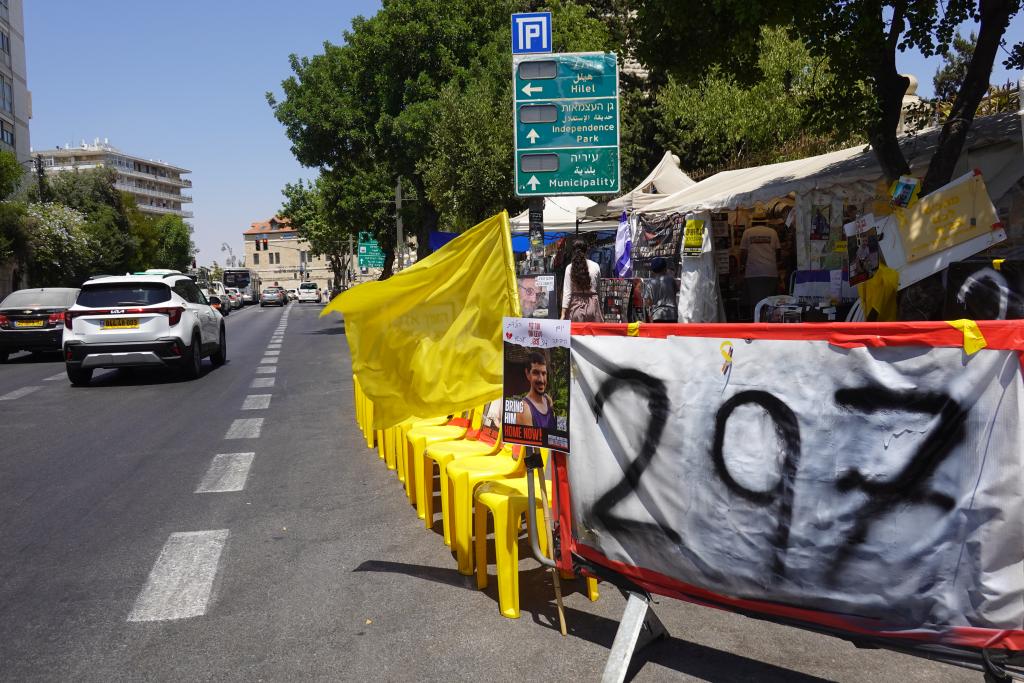 这是2024年7月29日在耶路撒冷加沙街以色列总理府附近拍摄的关于本轮巴以冲突持续时长的标牌。新华社记者王卓伦摄