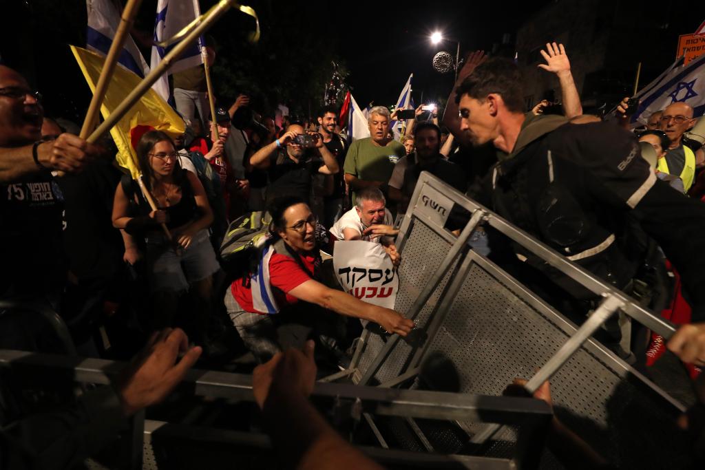 周六晚,位于耶路撒冷的以色列总理府前被游行示威者挤得水泄不通。时近午夜,愤怒的呼喊声响彻夜空。