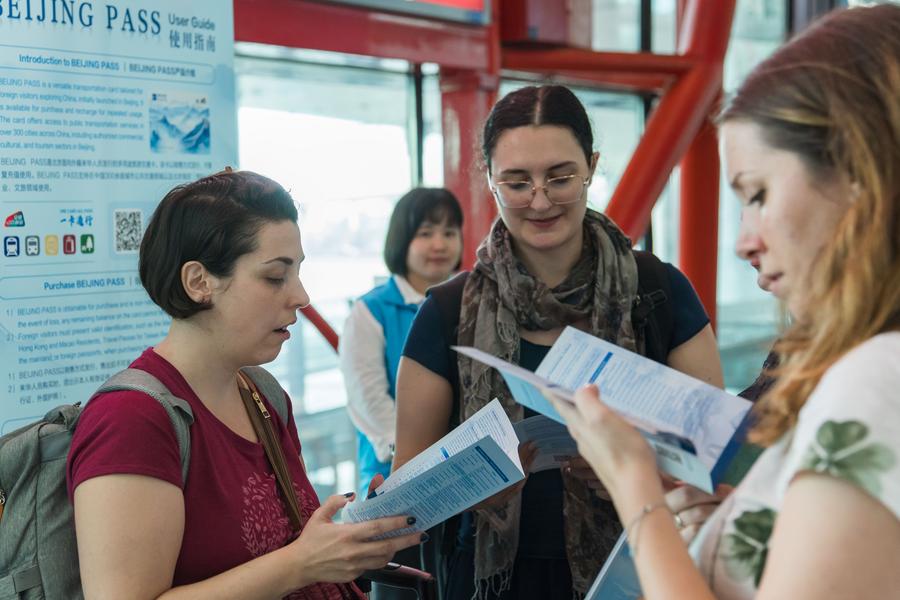 7月31日,外籍来华游客在北京首都国际机场阅览“BEIJING PASS”办理手册。新华社发