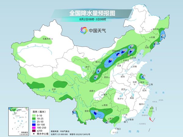 具体来看,中央气象台预计,今天,甘肃东部和南部、宁夏大部、陕西北部、山西北部、内蒙古中部、河北北部、北京、天津及黑龙江东南部、吉林东部、江苏中部、贵州南部、广西西部和南部、云南西部和东南部等地部分地区有中到大雨,其中,陕西北部、山西北部、内蒙古中部、河北北部、云南东南部等地部分地区有暴雨(50~90毫米)。